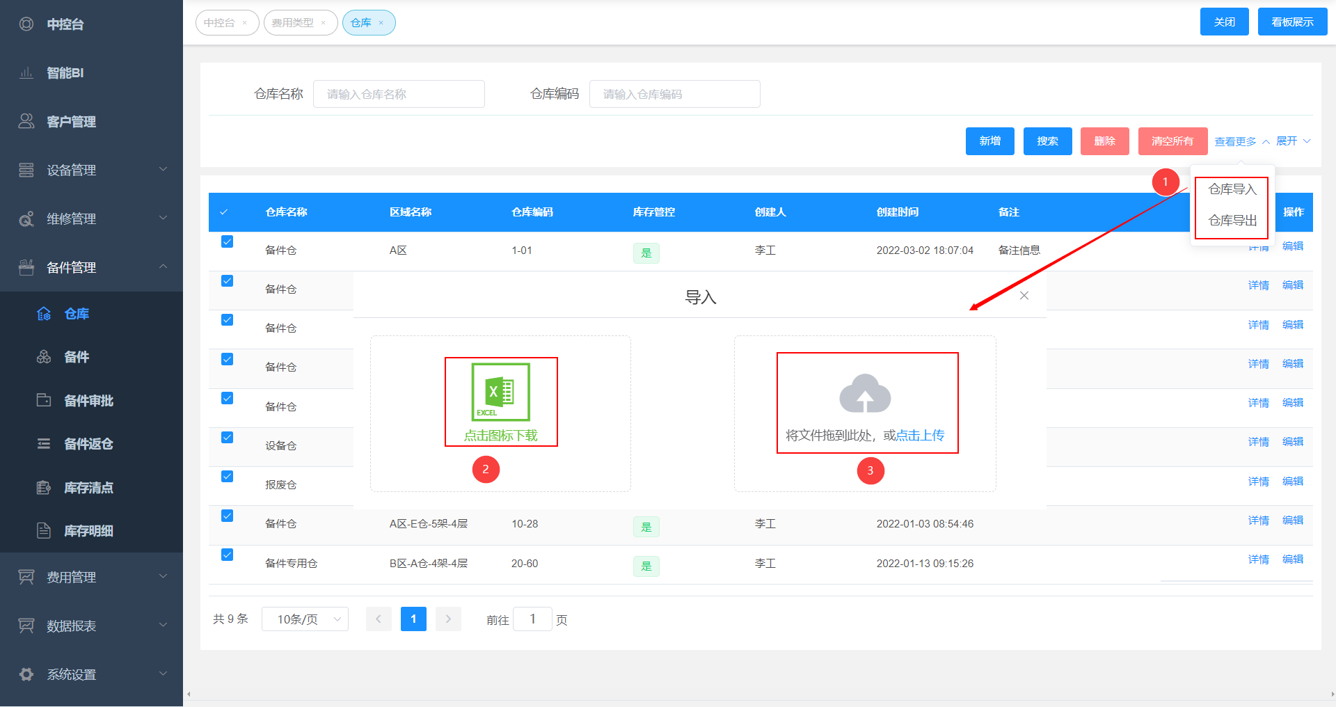 点击“导入-下载模板按钮”备件导入模板下载完成。